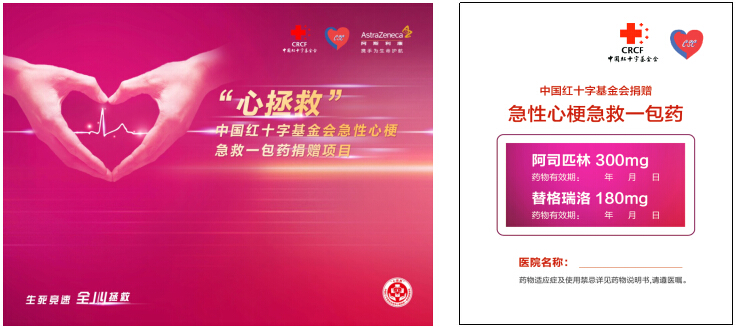 为此,本着弘扬人道、博爱、奉献的红十字精神,中国红十字基金会联合中华医学会心血管病学分会,与阿斯利康中国共同发起“心拯救”暨急性心梗急救一包药公益捐赠项目。项目计划捐赠急性心肌梗死急救一包药(阿司匹林300 mg和替格瑞洛180 mg),免费用于急性心梗患者,让患者在得到确诊后第一时间服用药物,及时启动双联抗血小板治疗,为患者节约了开具处方、付款、取药的时间,在更短时间内实施救治,实现更有力地拯救,真正做到了“患者等药”变成“药等患者”!