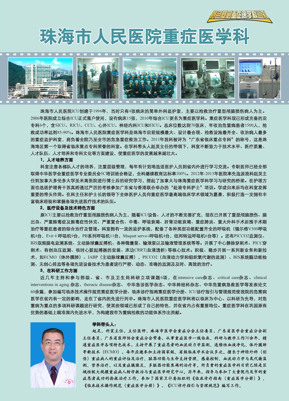 珠海市人民医院ICU创建于1994年,当时只有4张病床的简单外科监护室,主要以抢救治疗重型颅脑损伤病人为主。2006年医院成立综合ICU正式落户使用,设有病床15张,2010年综合ICU更名为重症医学科。重症医学科现已形成完备的亚专科6个,含SICU、RICU、CCU、心外ICU、神经内科ICU和EICU。总床位数达到70张床,年收治危重病患者1500人,抢救成功率达到85-90%。珠海市人民医院重症医学科是珠海市目前规模最大、设计最合理、抢救设施最齐全、收治病人最多的重症监护科室,肩负着全院乃至全市的危急重症救治工作。2011年我科被评为“广东省临床重点专科”的称号,这是珠海地区第一个取得省临床重点专科荣誉的科室。在学科带头人赵灵主任的带领下,科室不断致力于技术水平、医疗质量、人才队伍、人才培养和专科文化等方面建设,使重症医学的发展越来越壮大。