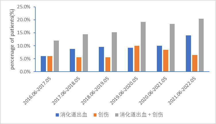 2016年6月至2022年6月在本院就诊符合纳入标准的急诊失血性休克患者共249例,仅收集急诊创伤和急性消化道出血患者,由急诊创伤和急性消化道出血引起的急诊失血性休克患者的就诊量是逐年上升的(图 1)。