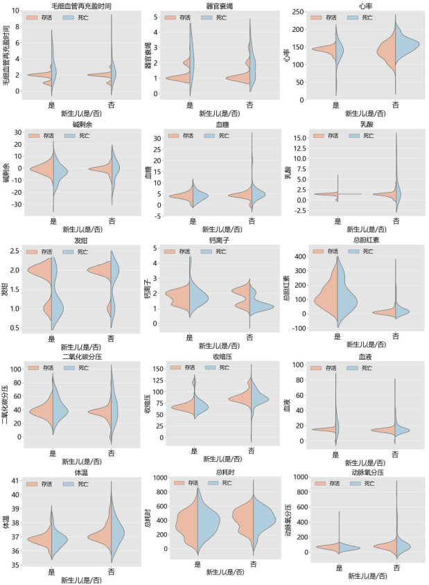 虽然已经根据决策树算法计算了每个特征的重要性,但这种方法是基于模型的,不利于可视化。本研究使用小提琴图将影响转诊结果程度的特征可视化,直观地分析各特征对区分转诊结果的重要性。如果同一特征上的死亡和生存分布差异较大,则该特征能更有效地区分结果,因此进一步量化小提琴图中生存和死亡的非重叠区域。区域越大,该特征对转诊结果的区分效果越好。根据碱剩余的小提琴图,当碱剩余很大或很小时,存活率显著降低。