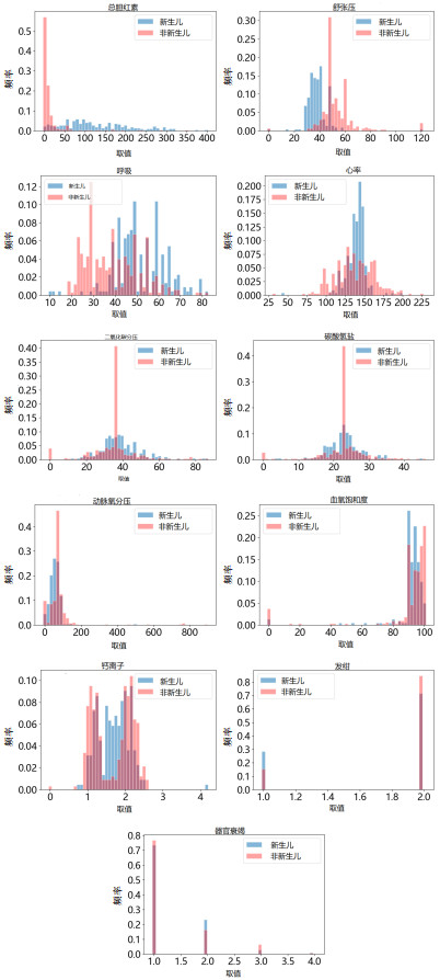 | 图 5 新生儿和非新生儿之间重要特征值的分布差异直方图 Fig 5 Histograms of differences in the distribution of important eigenvalues between newborns and non-newborns |