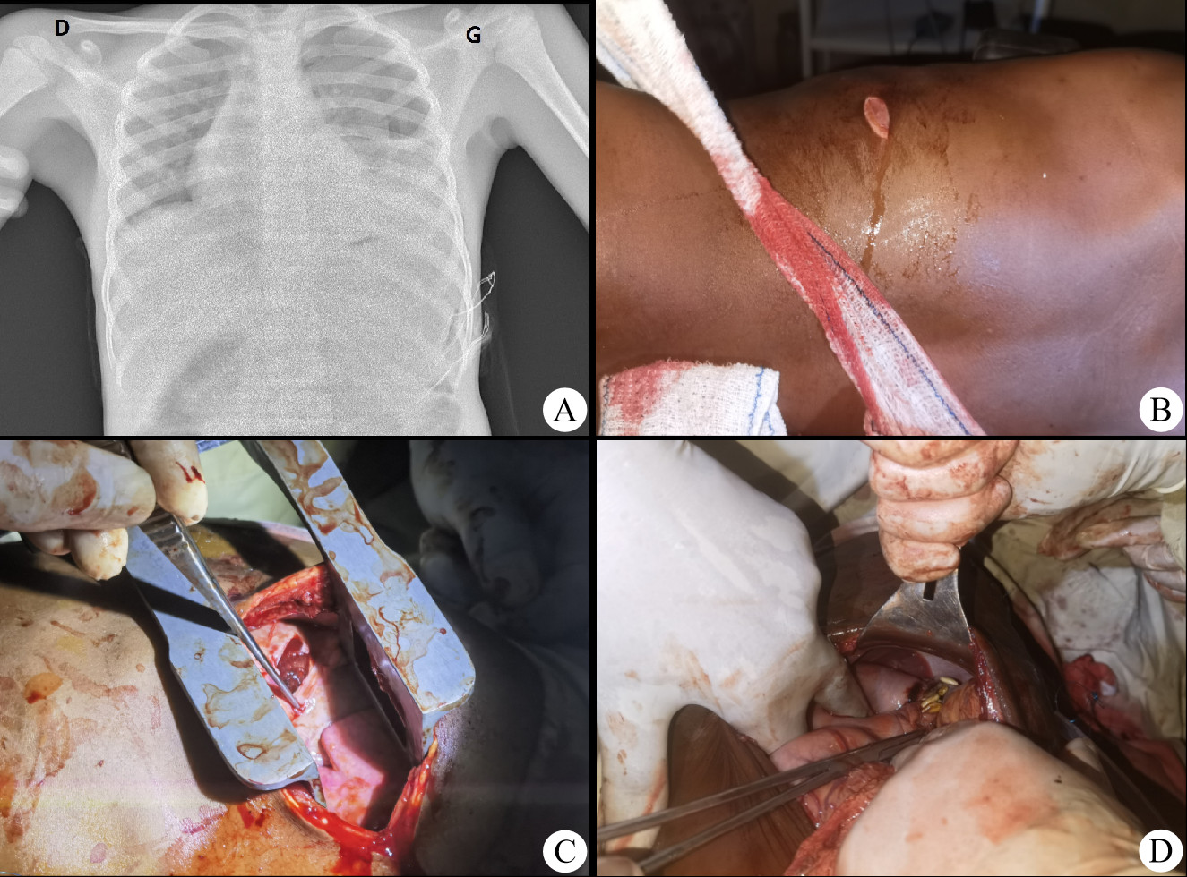 胸腹联合伤是指由同一致伤因素导致胸腹部脏器连续性损伤,包括膈肌损伤[1];外伤性心脏破裂是创伤急救中的危急重症,发病急骤、进展迅速,现场死亡率高,仅有少数患者能及时送入医院,若抢救及时,入院患者生存率可达80%以上[2-3]。在缺乏检查和治疗监护手段的非洲,胸腹联合伤并心脏破裂诊治困难,需要多学科协作。类似病例报道较少,现总结1例笔者援非期间在马达加斯加最贫困的南部地区医院接诊的羊角致胸腹联合伤并心脏破裂患儿诊疗过程,结合文献,探讨困难条件下的重大创伤救治。