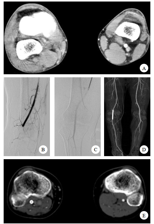 | 图 1 患者男,25岁 A:右膝关节脱位导致钝性腘动脉损伤;B:DSA显示腘动脉闭塞;C:植入肝素涂层的Viabahn覆膜支架开通腘动脉;D和E:术后8个月复查CTA提示右腘动脉显影良好、覆膜支架无变形 |