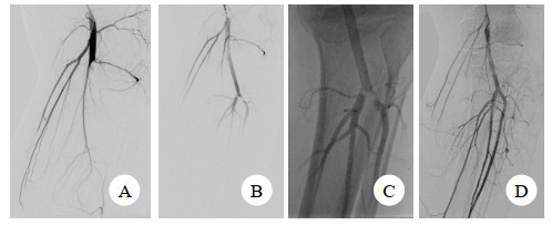 | 图 2 患者男,42岁 A.左胫骨平台骨折,钝性腘动脉损伤; B. 植入肝素涂层的Viabahn覆膜支架开通腘动脉;C. 术中发现血栓移位栓塞膝下动脉; D. 经导管接触性溶栓1 d后,血栓顺利清除,膝下动脉显影良好 |