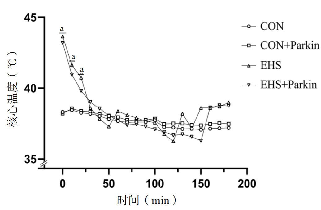 2 结果 2.1 各组大鼠核心温度变化CON组和CON+Parkin组的核心温度保持在37~38 ℃。劳力性热射病大鼠核心温度急剧升高,达到43 ℃。脱离热环境后,EHS组大鼠核心体温逐渐下降,在100 min~150 min其间,其核心温度低于CON组大鼠。与EHS组相比,EHS+Parkin组大鼠核心温度降至正常体温后,保持稳定。见图 1。