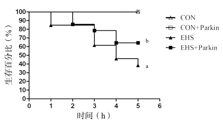 | 与CON组相比,aP<0.05;与EHS组相比,bP<0.05 图 2 Parkin过表达提高热射病大鼠的生存率 Fig 2 The over-expression of Parkin increases the survival rate of EHS rats |