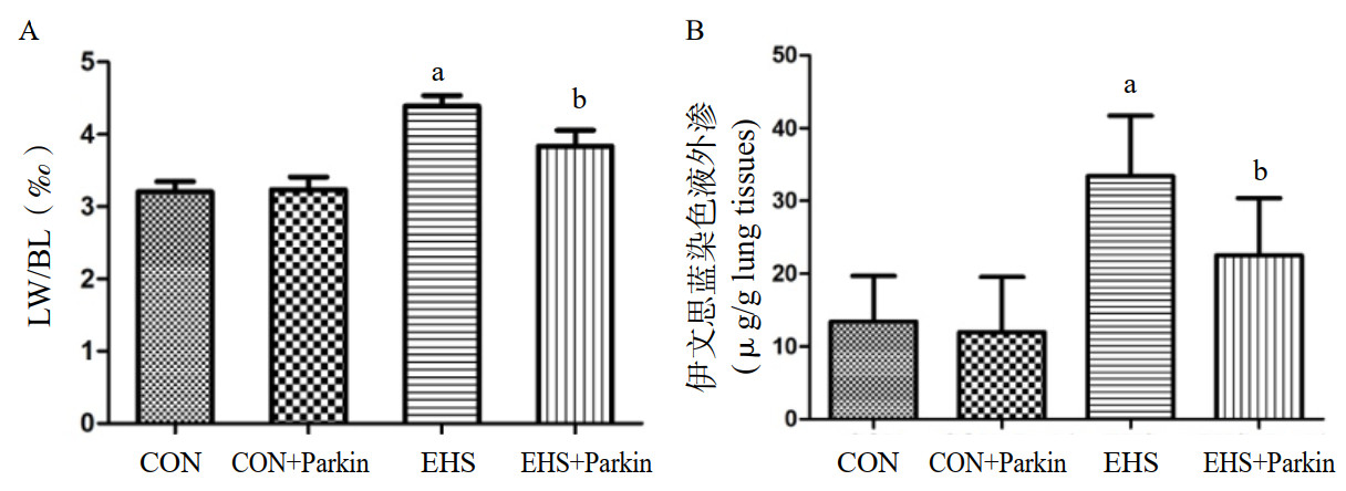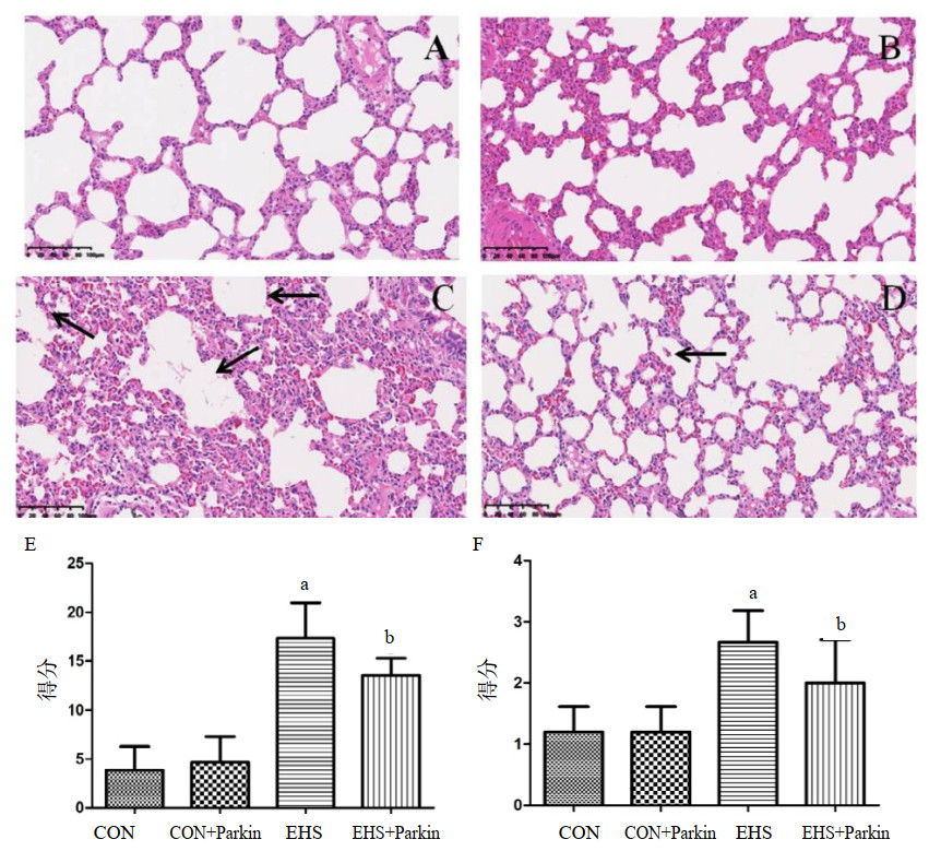 CON组和CON+Parkin组大鼠的肺组织结构清晰,肺泡壁光滑,且肺泡腔无液体渗出,见图 4A和图 4B;EHS组大鼠出现肺泡塌陷,肺泡腔出现大量的红细胞、炎症细胞和血浆样物质渗出,肺病理学评分和肺水肿评分明显增加(图 4C、图 4E和图 4F,P<0.05);和EHS组相比,EHS+Parkin组大鼠肺泡塌陷减少,炎症浸润程度低,肺泡内未见明显渗出物质,肺病理学评分和肺水肿评分较EHS组显著降低(P<0.05),见图 4D、图 4E和图 4F。