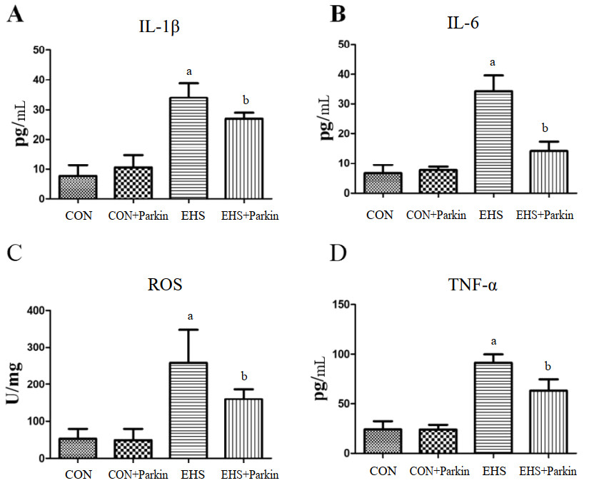 与CON组相比,EHS组大鼠肺组织中IL-6、IL-1β、TNF-α和ROS含量均显著增多(P<0.05);而EHS+Parkin组大鼠肺组织中上述细胞因子含量较EHS组均明显下降(P<0.05)。CON与CON+Parkin组相比较,上述细胞因子含量均差异无统计学意义(P>0.05),见图 5。