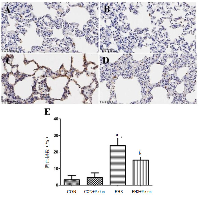 | A:CON组;B:CON+Parkin组;C:EHS组;D:EHS+Parkin组;棕色代表凋亡细胞。E:各组大鼠肺组织的凋亡指数;与CON组相比,aP<0.05;与EHS组相比,bP<0.05 图 6 Parkin过表达可以减少EHS大鼠肺组织细胞凋亡 Fig 6 Pulmonary apoptosis was attenuated to a greater extent in EHS+Parkin group rats |