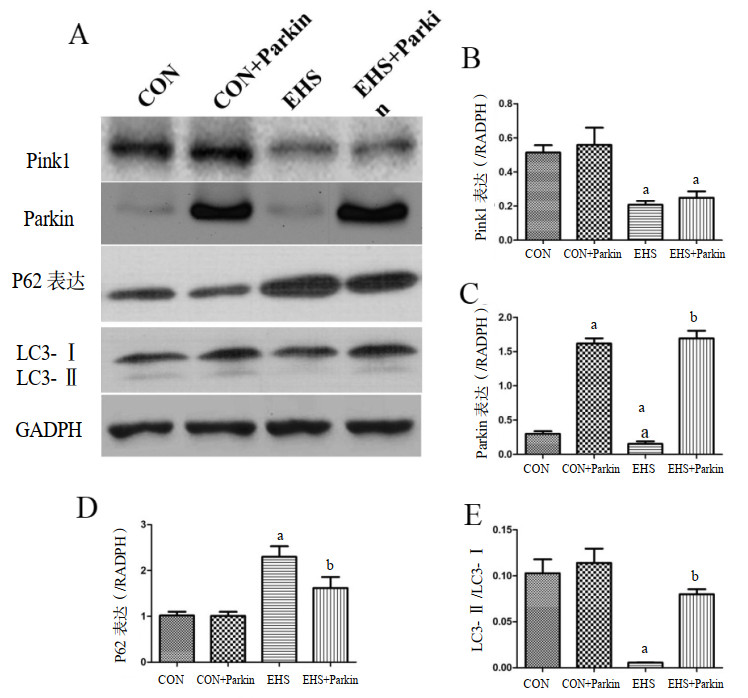 | A:各组大鼠肺组织中Pink1、Parkin、P62和LC3的蛋白表达;B、C、D和E:Pink1、Parkin、P62和LC3-Ⅱ/LC3-Ⅰ比值的统计图;与CON组相比,aP<0.05;与EHS组相比,bP<0.05 图 7 Parkin过表达增加EHS大鼠肺组织中的自噬水平 Fig 7 Parkin over-expression rats exhibited the increasing autophagy level in their lung |