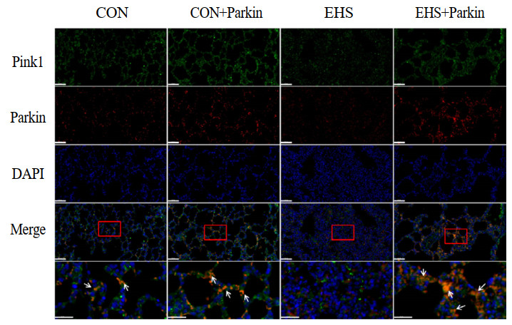 如图 8所示,免疫荧光结果显示,尾静脉注射携带Parkin基因腺相关病毒后,CON+Parkin组和EHS+Parkin组大鼠肺组织中Parkin荧光强度均显著增强(红色荧光)。与CON比较,EHS组大鼠肺组织中Pink1(绿色荧光)和Parkin(红色荧光)共定位荧光强度减弱(橙色荧光);而HS+Parkin组大鼠肺组织中Pink1(绿色荧光)与Parkin(红色荧光)共定位荧光强度较EHS组显著增强。CON+Parkin组与CON相比,肺组织中Pink1荧光强度(绿色荧光)无变化,Pink1(绿色荧光)与Parkin(红色荧光)共定位荧光强度(橙色荧光)略有增强。