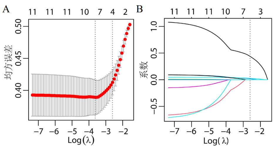 使用LASSO回归模型进行特征选择。A:图为在LASSO模型中通过10折交叉验证法筛选惩罚系数(λ)最佳值的过程,左垂直线表示最小λ值,即均方误差最小的λ值;右垂线表示最小λ值右侧的1个标准误,在该取值下,纳入方程的变量个数更少,模型更简单;故本研究中选择此值作为最终方程筛选标准,此时λ值为0.074,Log(λ)=-2.603。B:图为变量系数的变化特征。随着惩罚系数(λ)向右增大,越来越多的变量系数被压缩,最后系数被压缩为0,最终选出神志情况、呼吸频率、APACHE Ⅱ、CD4等在Log(λ)=-2.603时非零系数的变量,从而实现变量的降维和筛选 图 1 LASSO回归特征筛选图 Fig 1 LASSO regression feature screening graph
