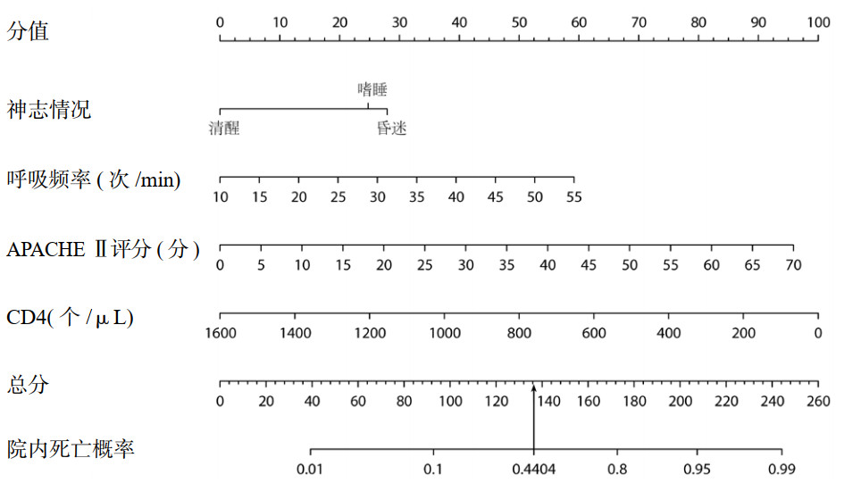 死亡相关因素的单因素分析筛选出在两组之间差异有统计学意义的10项变量,并通过采用最小绝对收缩和选择运算符(LASSO),通过收缩大的回归系数来降低过拟合程度,最终神志情况、呼吸频率、APACHE评分、CD4等保留在最终模型中。这些变量不同于广泛使用但复杂的评分系统,在大多数医疗机构中都很容易获得,并且与身体的各个系统密切相关。