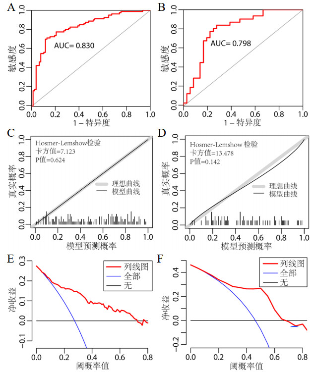 区分度评价:建模集AUC值为0.830(0.764-0.895),验证集AUC值为0.798(0.689-0.908),说明本研究建立的预测模型具有很好的区分能力(图 3A3B)。校准度评价:建模集和验证集校准曲线图显示,图中黑色的模型拟合曲线与理想曲线有较好的吻合度;建模集Hosmer-Lemshow检验结果显示χ2=7.12和P=0.624,验证集Hosmer-Lemshow检验结果显示χ2=13.478和P=0.142,提示模型预测有较好的准确性(图 3C3D)。适用性评价:通过DCA分析评估该模型的临床适用性(见图 3E3F),图中蓝线表示对所有人进行干预时所获取的净收益,黑线表示不对任何人进行干预时所获取的净收益,红色线表示本模型所获取的净收益,结果显示模型红线基本高于蓝线和黑线,表明该模型的净收益显著高于两个极端状况,即患者可从该模型中获益,具有较好的临床适用性。