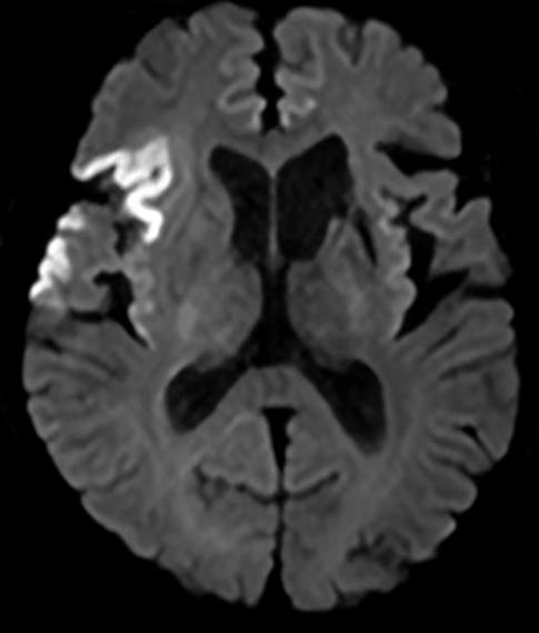 右侧额顶颞叶、岛叶急性脑梗死 图 1 患者头颅磁共振DWI