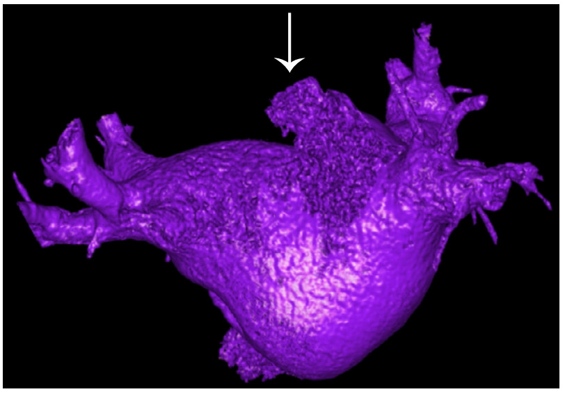 图 2 患者左心房及肺静脉CT三维重建(白色箭头)