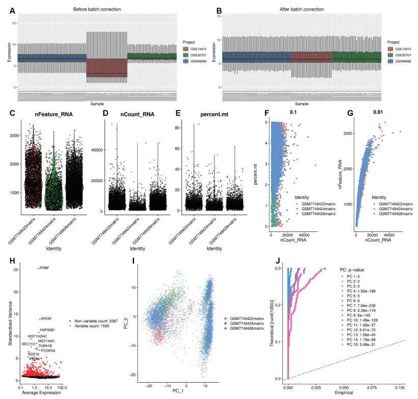 A-B: Transcriptome data merged after eliminating batch effects. C-G: Quality control of GSE242127 single-cell sequencing data. H: The top 1500 high-variable genes of GSE242127 annotated as signature genes. I-J: PCA of GSE242127 图 1 转录组和单细胞测序数据的处理 Fig 1 The processing of transcriptome and single-cell sequencing data