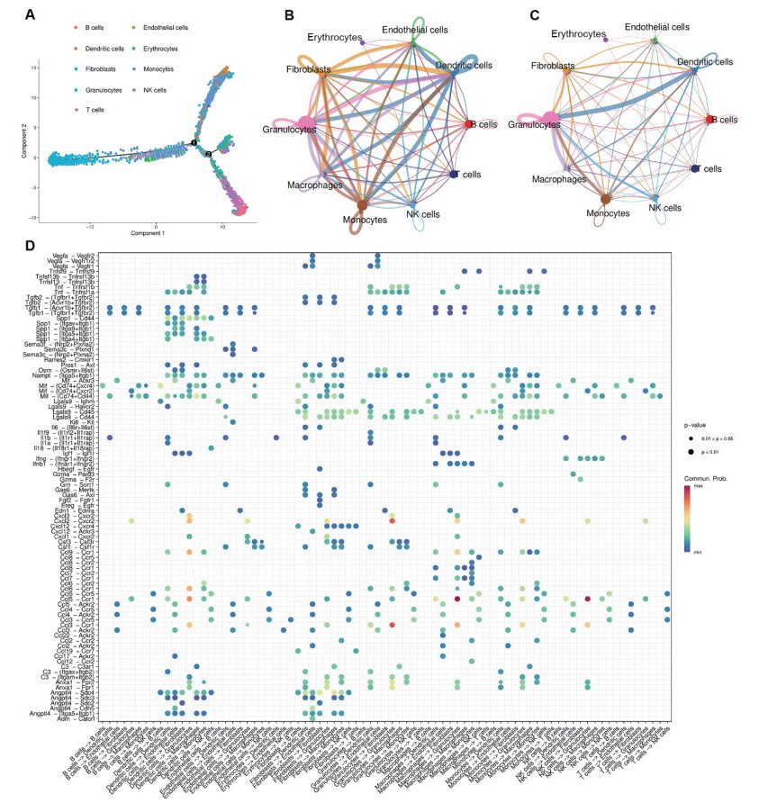 伪时序分析建立细胞分化轨迹,轨迹内高度变异基因用于细胞注释,其中免疫细胞分化轨迹中的高变异基因标注为免疫分化相关基因(immunodifferentiation-related genes,IDRGs)。使用“CellChat”预测细胞通讯及其相关信号通路和配体-受体对。