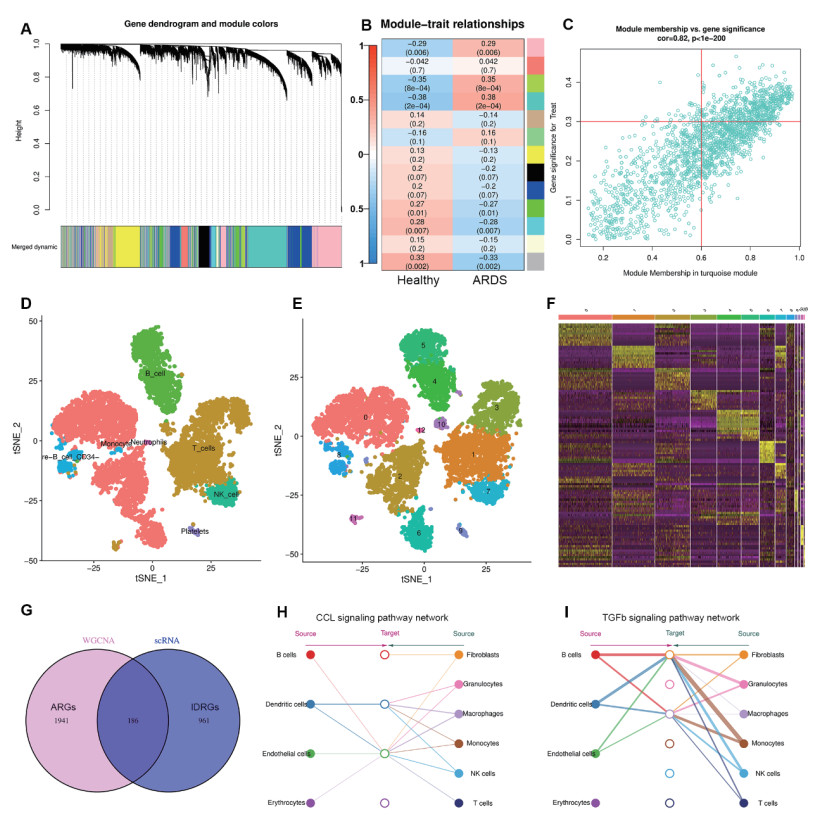 WGNCA对基因和表型聚类(图 3A),并评估基因模块与表型模块(健康vs. ARDS)的相关性(图 3B),与脓毒性ARDS相关性最显著的天青色模块(turquoise module)(r=0.38,P < 0.05)内的1075个核心基因标注为ARGs(MM > 0.6,GS > 0.3)(图 3C)。人脓毒性ARDS全血单细胞测序样本(GSE242127_ GSM7749422、GSE242127_GSM7749424和GSE242127_GSM7749426)经降维聚类后的细胞分群包含单核细胞、T细胞、B细胞、NK细胞、血小板和中性粒细胞(图 3D),对应13个clusters(图 3E),它们中的高变异基因以热图的形式展示(图 3F),排除血小板(cluster 9)外的1147个高变异基因标注为IDRGs。取ARGs和IDRGs的186个交集基因(图 3G),细胞通讯分析显示它们激活了CCL和TGFb信号通路,涉及免疫细胞对内皮细胞和成纤维细胞的调控(图 3H~I)。