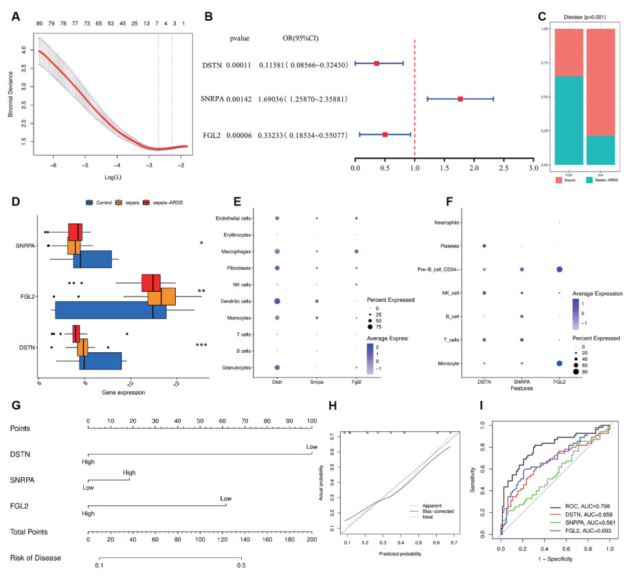 A-B: Lasso regression analysis established RS containing DSTN, SNRPA, and FGL2. C: Correlation analysis between RS and clinical characteristic. D: Differential expression of DSTN, SNRPA and FGL2 in healthy, sepsis and septic ARDS. E: Dstn, Snrpa, and Fgl2 affect cell differentiation in mice with septic acute lung injury. F: DSTN, SNRPA and FGL2 affect cell differentiation in human with septic ARDS. G: A nomogram predicting the progression of sepsis to septic ARDS. H-I: DCA and ROC test the validity and accuracy of RS. 图 4 构建RS Fig 4 Construction of RS