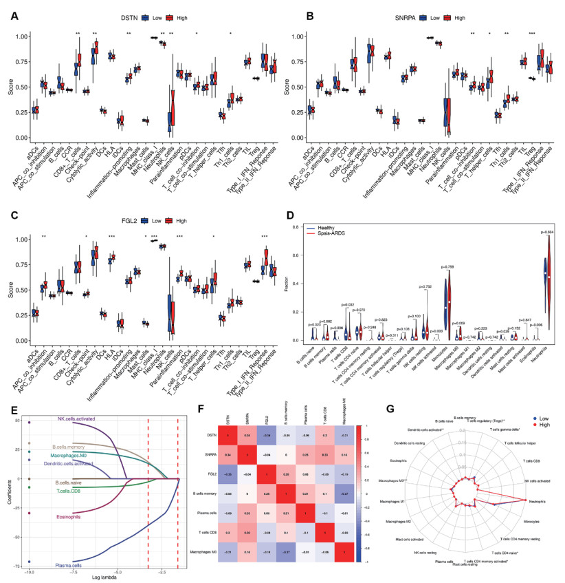 使用CIBERSORT评估免疫浸润;以基因表达中位值将患者分为高表达组(High)和低表达组(Low),使用ssGSEA评估基因表达对免疫细胞丰度的影响。使用Lasso回归分析筛选ARDS相关的免疫细胞,“Corrplot”包展示基因与免疫细胞的相关性。