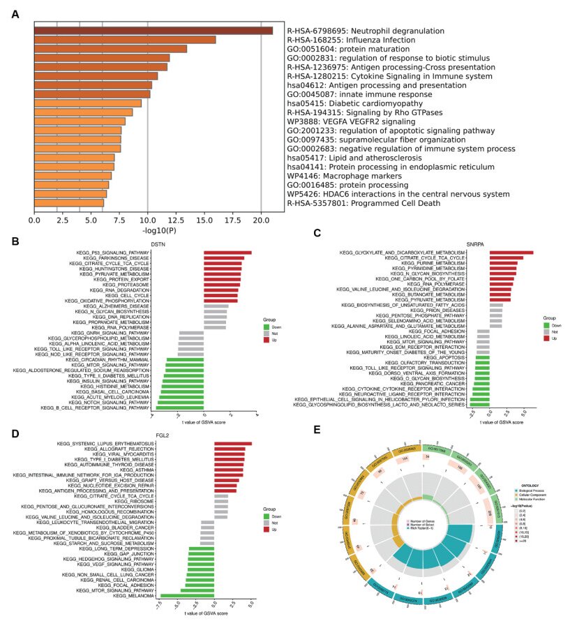 A: The biological functions of the intersecting genes of ARGs and IDRGs. B-D: DSTN, SNRPA, and FGL2-related signaling pathways assessed by GSVA. E: RS-related biological functions assessed by GO analysis 图 6 RS相关生物学功能 Fig 6 RS-related biological functions
