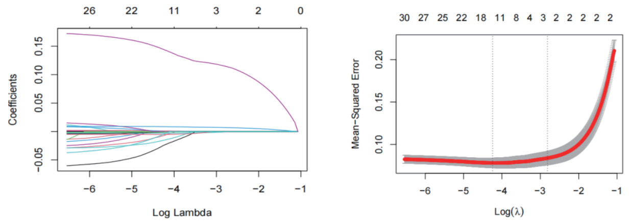 图 1 建模人群的LASSO回归模型危险因素筛选 Fig 1 Screening for risk factors in the modeling group using the LASSO binary logistic regression model.