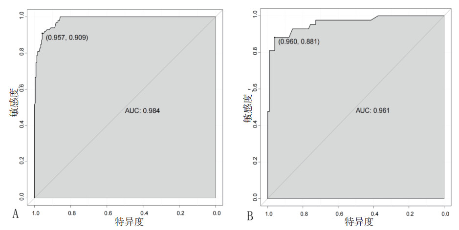 通过绘制两组人群的ROC曲线分析结果提示,预测模型在建模人群中预测价值曲线下面积(AUC)为0.984(95%CI: 0.975~0.994),敏感度为0.909,特异度为0.957(图 3A);在验证人群中AUC为0.961(95%CI: 0.926~0.996),敏感度为0.881,特异度为0.960(图 3B),表明预测模型具有良好的区分度。