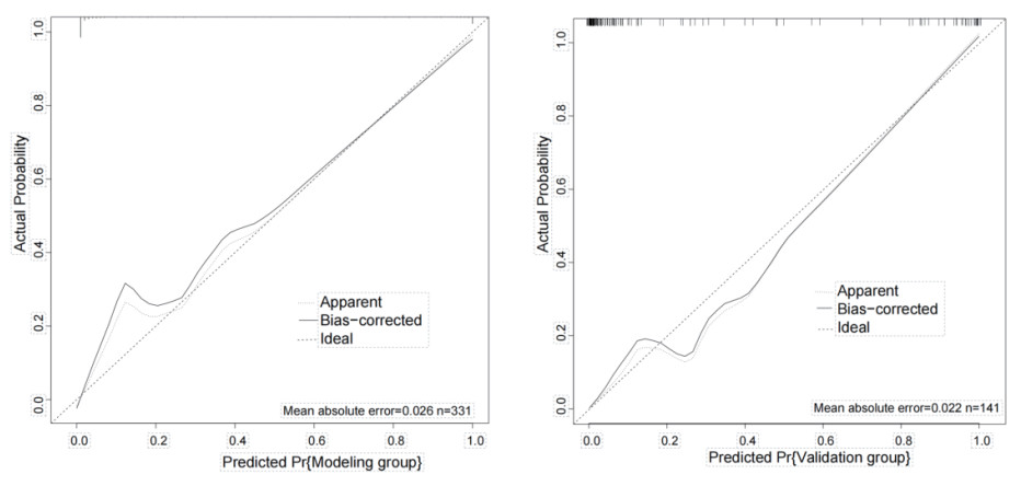 图 4 预测模型在建模和验证人群中的校准曲线 Fig 4 Calibration curve of the prediction model in the modeling and validation groups
