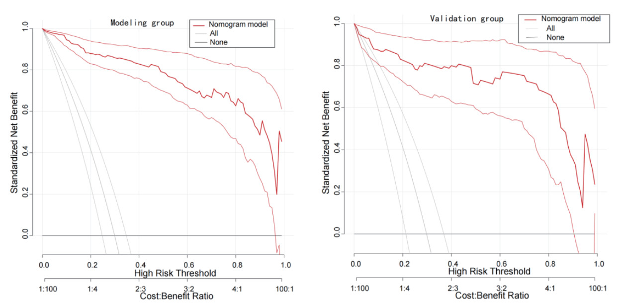 图 5 预测模型在建模和验证人群中的决策曲线 Fig 5 Decision curve of the prediction model in the modeling and validation groups