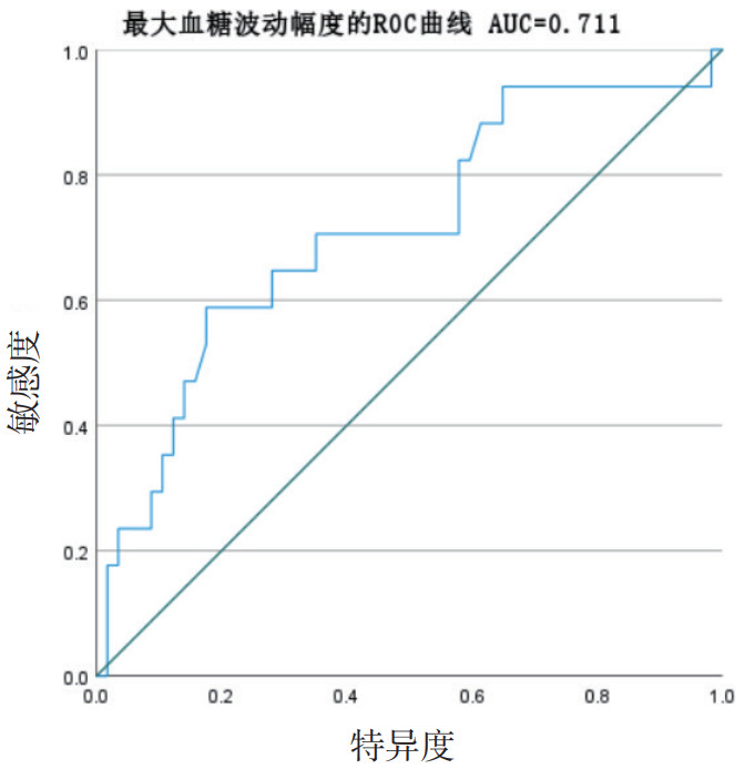 | 图 1 最大血糖波动幅度与28 d内死亡的ROC曲线 Fig 1 ROC curve of maximum blood glucose fluctuation and 28-day mortality |