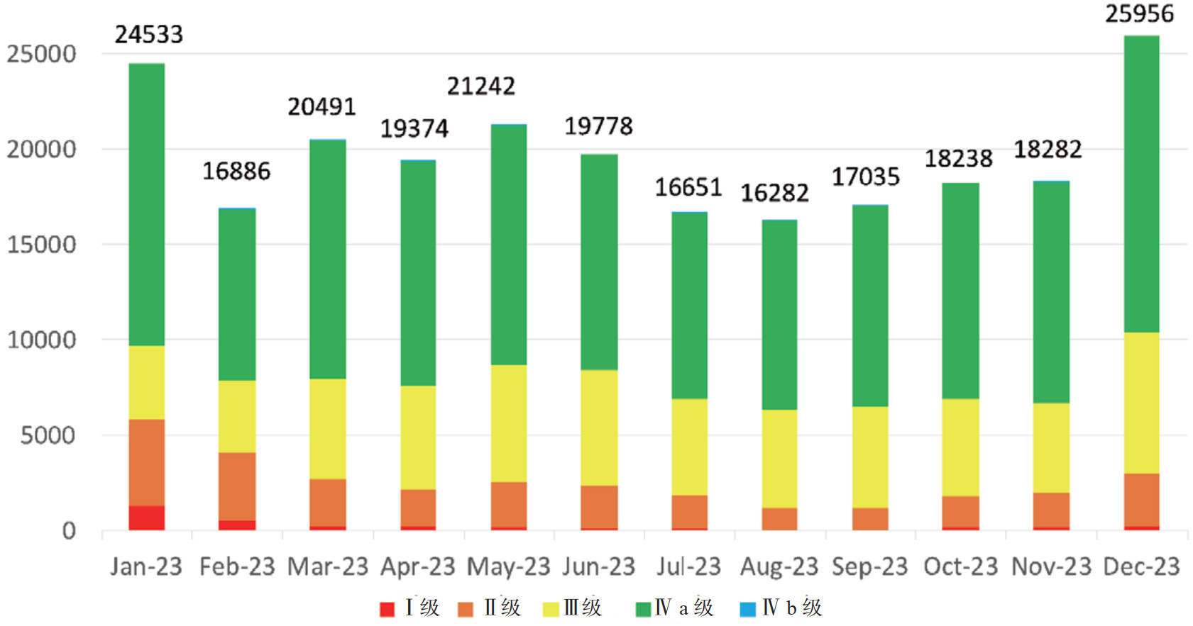 | 图 1 2023年1月至2023年12月成人急诊分诊量和分级 |