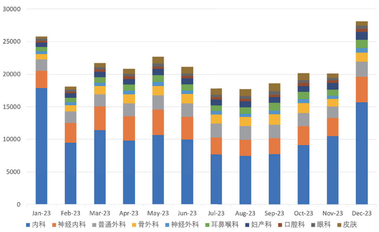 | 图 2 2023年1月至2023年12月成人急诊分诊科室分布 |