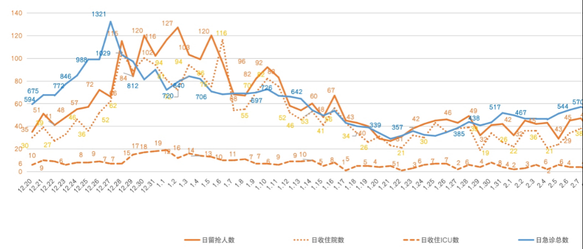 本研究为回顾性研究,根据急诊患者流量峰谷曲线(见图 1),将2022年12月20日至2023年1月21日作为战时组,前一时期2022年10月20日至2022年11月21日纳入环比组,同期2021年12月20日至2022年1月21日纳入同比组。通过院内信息系统和急诊信息系统平台导入并统计急诊总就诊人次和抢救区及诊疗区就诊人次、每日就诊人次、诊疗区转抢救区域患者人次、内科就诊人次、院前急救服务(120)转诊人次。