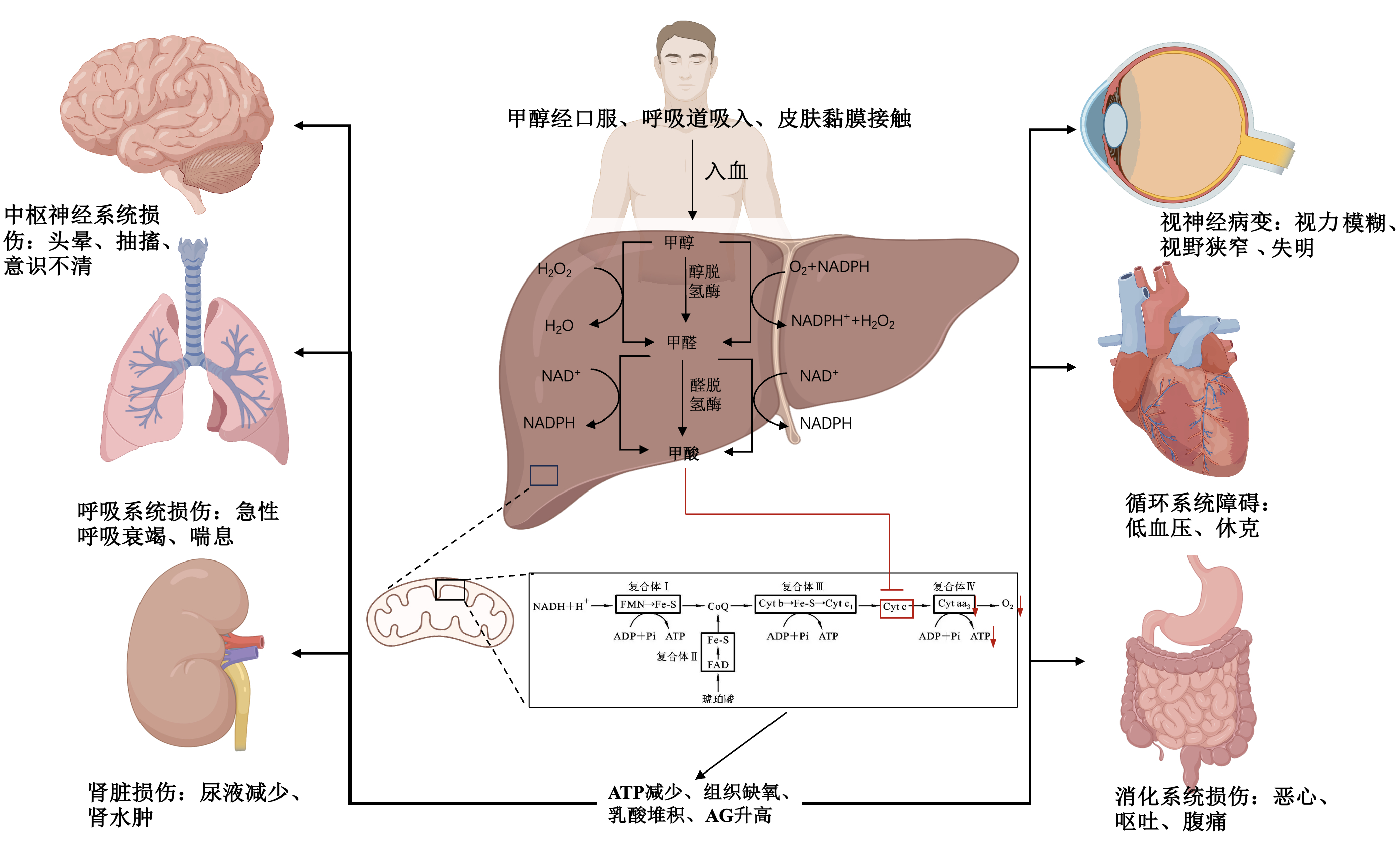 甲酸与细胞色素氧化酶结合,引起组织缺氧,抑制视网膜和视神经线粒体功能,致ATP耗竭,降低Na+-K+-ATP酶泵活性,阻碍动作电位,伤及髓鞘,损害视力。它还导致轴浆流动停滞、轴突内肿胀和视盘水肿,造成神经纤维压迫性损伤。阻止蛋白质、线粒体和神经小管从细胞向轴质纤维流动,导致神经传导缺陷和视力丧失,约25%的患者视力不可恢复。