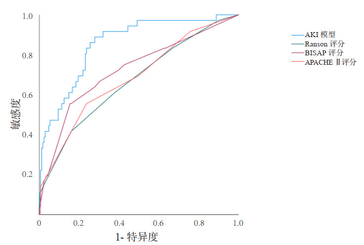 采用SPSS 27.0软件进行统计学分析。符合正态分布的计量资料以均数±标准差(x±s)表示,组间比较采用成组t检验。非正态分布的计量资料以中位数及四分位数间距[M(Q1, Q3)]表示,组间比较采用Kruskal-wallis秩和检验。计数资料以例(百分率)表示,组间比较采用卡方检验或Fisher精确概率法。采用Logistic回归分析建立AP并发AKI的风险评估模型。计算所建模型的诊断敏感度、特异度,绘制受试者工作特征曲线(reciver operating characteristic curve, ROC)并计算曲线下面积(area under the curve, AUC),并与APACHE Ⅱ评分、Ranson评分、BISAP评分、CTSI评分的诊断价值进行比较。以P < 0.05为差异有统计学意义。
