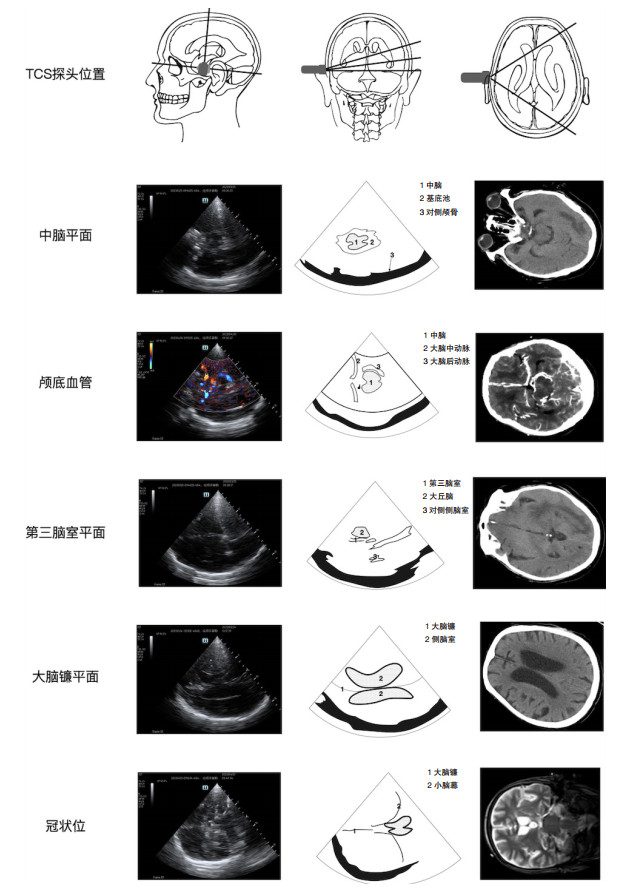 本研究TCS应用床旁超声(深圳迈瑞生物医疗电子股份有限公司,TE7型)的相控阵探头完成,选择“经颅多普勒”模式,超声探头频率在1.3~3.2 MHz,深度在15~17 cm,可自动根据灰度对比进行显示调整,黑白超声模式用于颅内结构的观察,彩色多普勒模式用于对颅内动脉系统的观察,红色代表朝向探头血流,蓝色代表反向探头血流。探头位置采用颞窗位[5],一般位于观察同侧耳前上方1 cm处,部分在耳上方、前方或后方,需根据患者具体情况选择最佳成像颞窗位。最佳颞窗位确定后首先探头垂直颅骨,标记点指向同侧眼角,图像中部蝶形低密度区域为中脑,此为中脑平面,周围可见密度偏高基底池影,前方可见下丘脑,后侧可见小脑引部,对侧高密度可见对侧颅骨,其间可见对侧颞叶。在此平面应用彩色多普勒模式可见大脑中动脉、大脑前动脉、大脑后动脉、前交通动脉、Willis环等颅内血管结构。继续该观察点,超声探头角度向头顶倾斜约10°,可见中部高亮类似于“=”的解剖结构为第三脑室,如成像清晰可在同侧旁见丘脑、基底节、内囊等解剖结构,对侧可见两条高亮线型间包含低密度区域为对侧侧脑室,其间可见高密度搏动为侧脑室内脉络丛。在此平面再将超声探头角度向头顶倾斜约10°可见前中部呈线状高亮的大脑镰,及部分对侧侧脑室前角。恢复探头垂直,转动探头90°,标记点朝向头顶,可获得冠状位图像,可根据图像前后5~10°倾斜探头进行观察,可见小脑幕、部分小脑、第三脑室、侧脑室、颈内动脉、基底动脉等解剖结构(见图 1)。超声检查人员为经过规范急诊超声培训的急诊科医生。