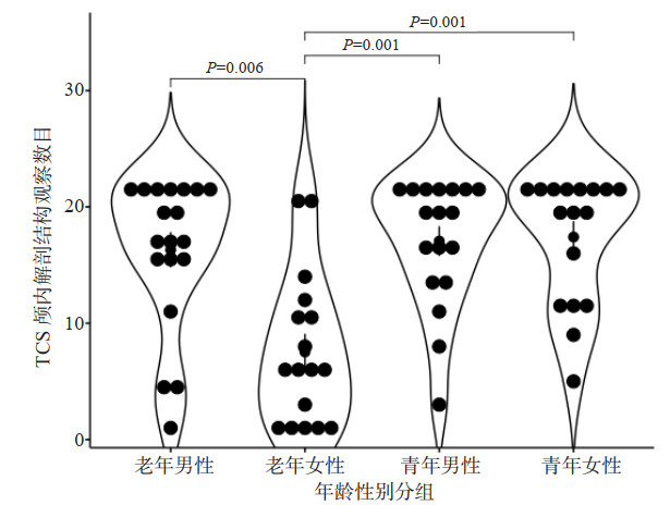 根据年龄与性别将纳入样本分为四组,各组TCS观察颅内结构分别为:老年男性组17(15, 22)处,老年女性组6(1, 11)处,青年男性组19(14, 21)处,青年女性组20(12, 22)处。其中青年男性组TCS可观测颅内解剖结构数的中位数最大,老年女性组最小。对各组进行组间统计学比较并校正,老年男性、青年男性、青年女性三组间差异无统计学意义(均P > 0.05),老年女性组与其他组间均差异有统计学意义。见图 2