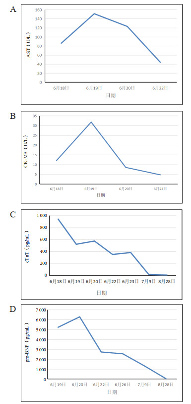 患者入院后仍间断性发热,最高38.8℃。患者入院第3天(6月20日),进行病原微生物mNGS检测,检测范围包括细菌(包括分枝杆菌、支原体、衣原体、立克次体和螺旋体)、真菌、病毒(DNA病毒、RNA病毒)。6月23日报告检验结果:检出伯氏考克斯氏体,序列数74,疑似背景微生物中痤疮丙酸杆菌序列数1,其他细菌、真菌、病毒、寄生虫及其他病原微生物均未检出。结合患者的临床表现及目前的辅助检查结果,考虑患者诊断为Q热引起的心肌炎,停用现在的抗菌药物,给与多西环素0.1 g每12 h 1次抗感染,并动态复查心电图、心脏彩超及检测心肌酶AST、CK-MB、肌钙蛋白T、pro-BNP(见表 1,图 1、图 2)。
