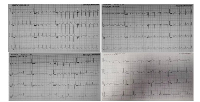 心脏彩超(6月24日)示:心脏结构及血流未见明显异常,EF值60%。下肢血管彩超(6月26日)示:右侧股动脉管壁均匀增厚,呈“同心圆”改变,厚度0.17 cm,左侧股动脉管壁不均匀增厚,最厚0.16 cm,余未见明显异常。7月9日,下肢血管彩超示:双侧股动脉未见明显异常;心脏彩超示:心脏结构及血流未见明显异常,EF值68%。患者更改抗生素后体温下降,未再出现发热,病情稳定后于2023年6月28日治愈出院,随访3个月患者心电图、心脏彩超、肌钙蛋白、pro-BNP均恢复正常。