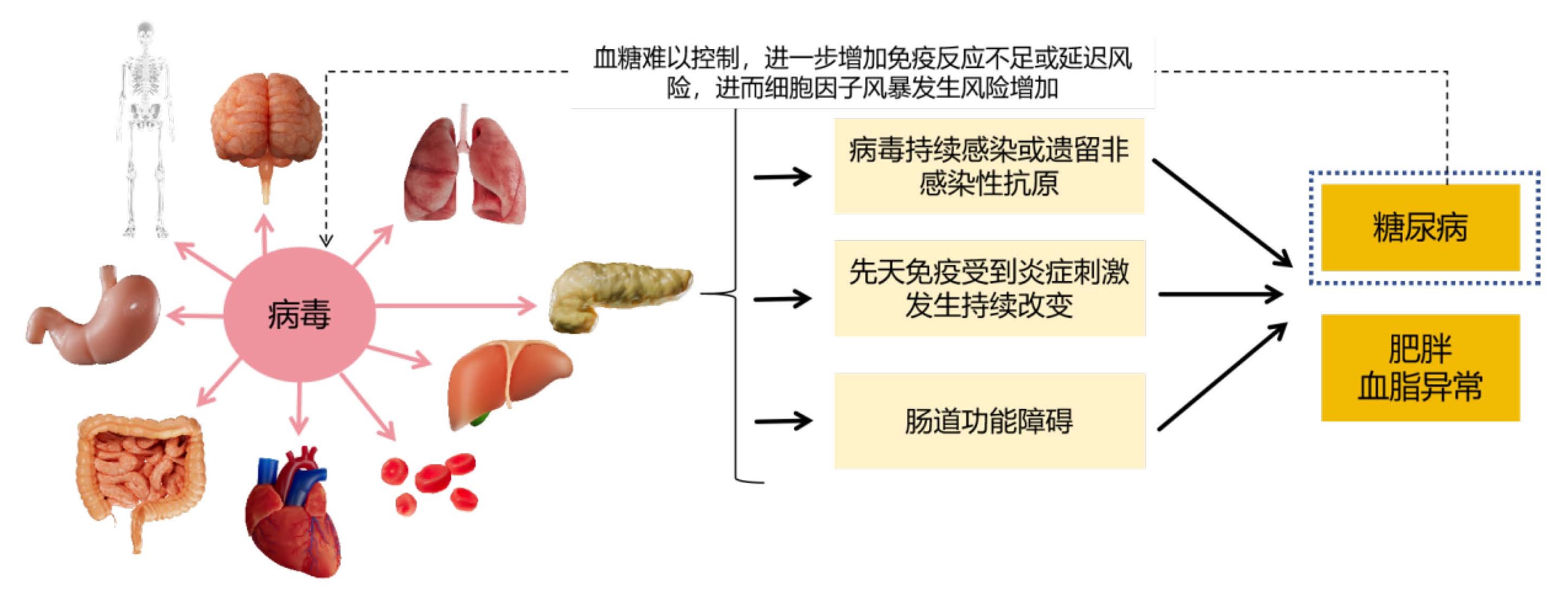 | 实线箭头代表的是病毒对相应器官或代谢影响;虚线代表病毒对糖代谢影响形成恶行循环的潜在机制。 图 1 病毒感染时可以侵袭机体多个系统并持续存在对机体造成的潜在影响(以糖尿病为例)(引自医脉通) |