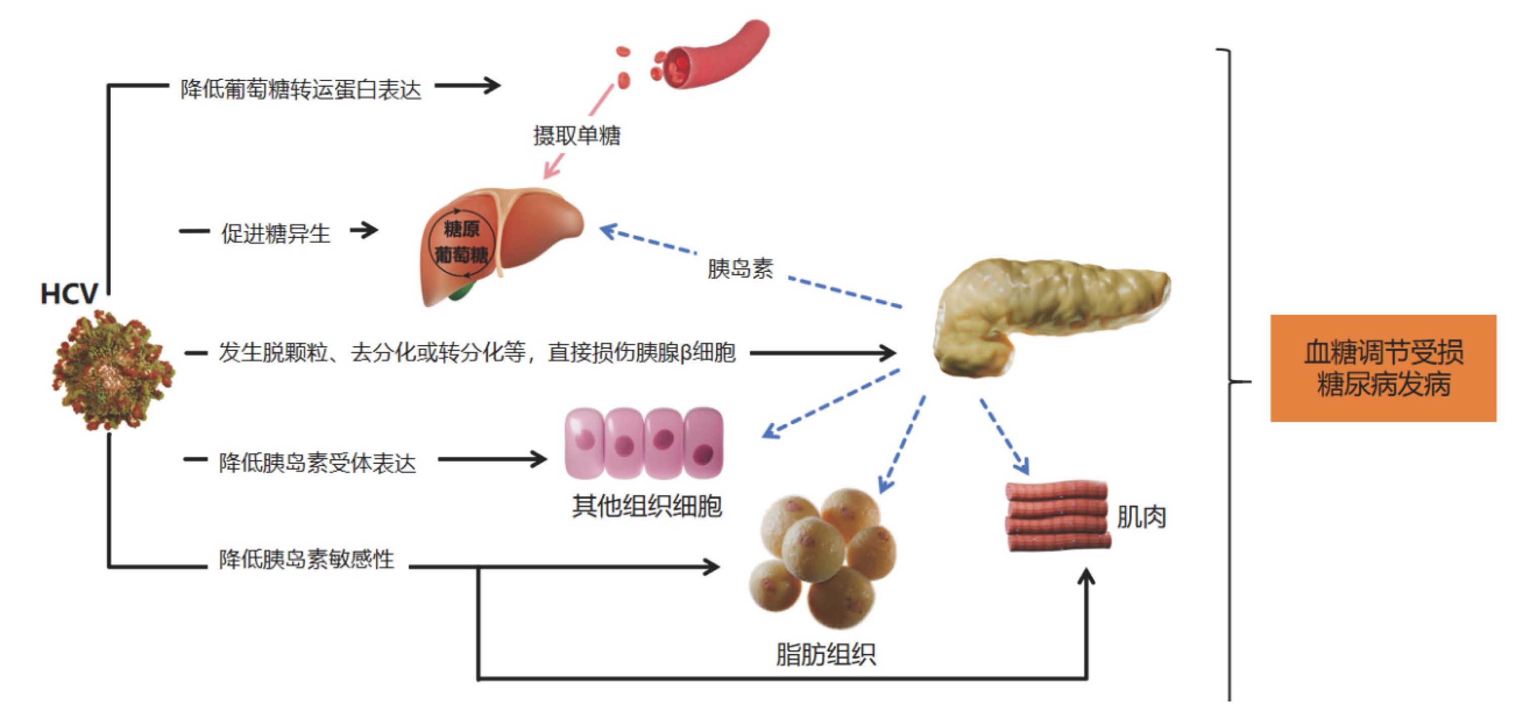 | 实线箭头代表HCV病毒通过对不同器官或组织代谢的影响;虚线代表胰腺受损之后对上述反应应激的非同步导致的代谢进一步紊乱的可能机制。 图 2 病毒感染后对机体血糖调节系统的影响(乙肝病毒感染为例)(引自医脉通) |