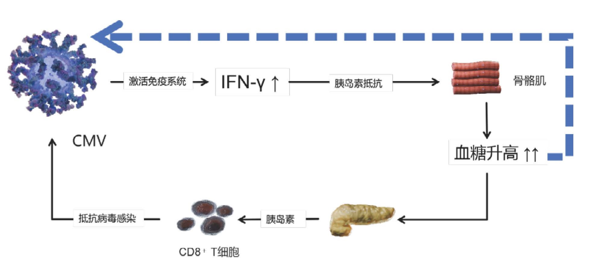 | 实线箭头代表机体抵抗病毒感染的机制。但是可能会最终以加重代谢紊乱,牺牲了血糖明显升高进而增加病毒感染可能性为代价(虚线箭头所示)。 图 3 病毒感染后对机体的影响(CMV为例)(引自医脉通) |