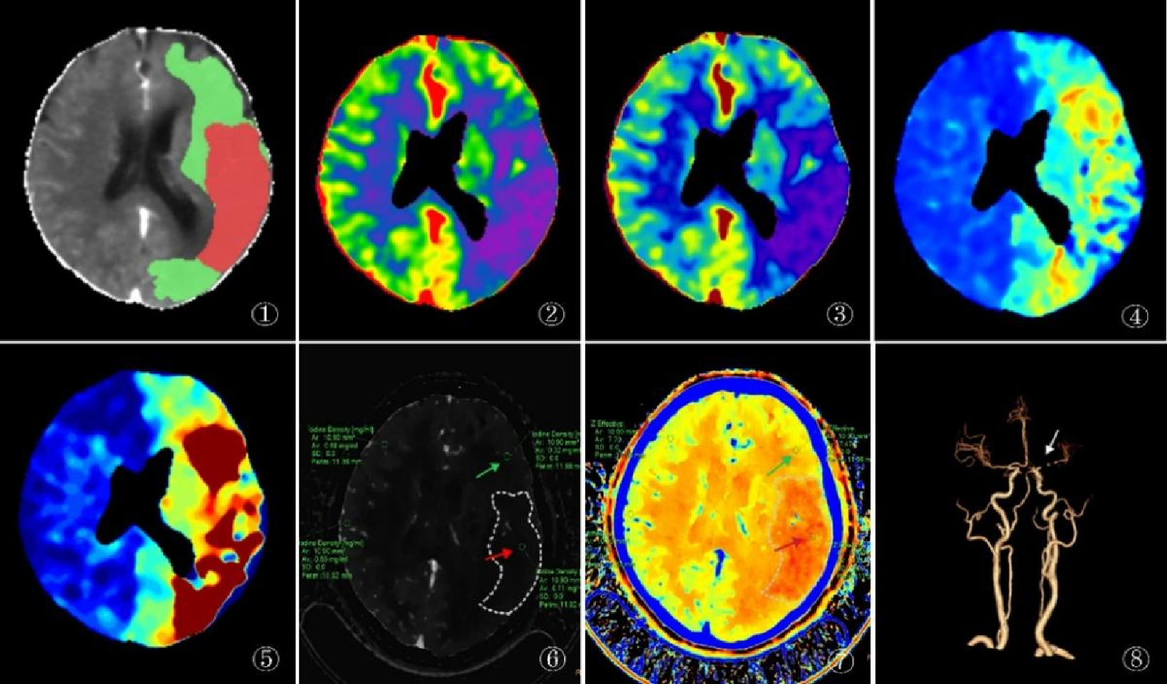 | A为CTP后处理得到的像,红色区域提示梗死核心,绿色区域提示半暗带;B~E分别为CTP的脑血流量(CBF)、脑血容量(CBV)、平均通过时间(MTT)、脑血流残余功能达峰时间(Tmax),CTP参数像显示左侧大脑半球呈低灌注改变,CBV、CBF较对侧减低,MTT、Tmax较对侧延长;F、G分别为光谱CTA碘密度与有效原子序数,显示左侧大脑半球灌注缺损,可见梗死核心区(红色箭头)及半暗带区(绿色箭头)的碘密度值分别为0.11 mg/mL、0.32 mg/mL,显著低于对侧正常脑实质区域的0.65 mg/mL、0.68 mg/mL,梗死核心区及半暗带区的有效原子序数值分别为7.33、7.47,显著低于对侧的7.68、7.70;H为CTA像显示正常大脑中动脉M1段重度狭窄、闭塞,其分支稀疏(白色箭头) 图 1 急性缺血性脑卒中患者的CTP和光谱CTA图像 Fig 1 CTP and spectral CTA Images of acute ischemic stroke patients |