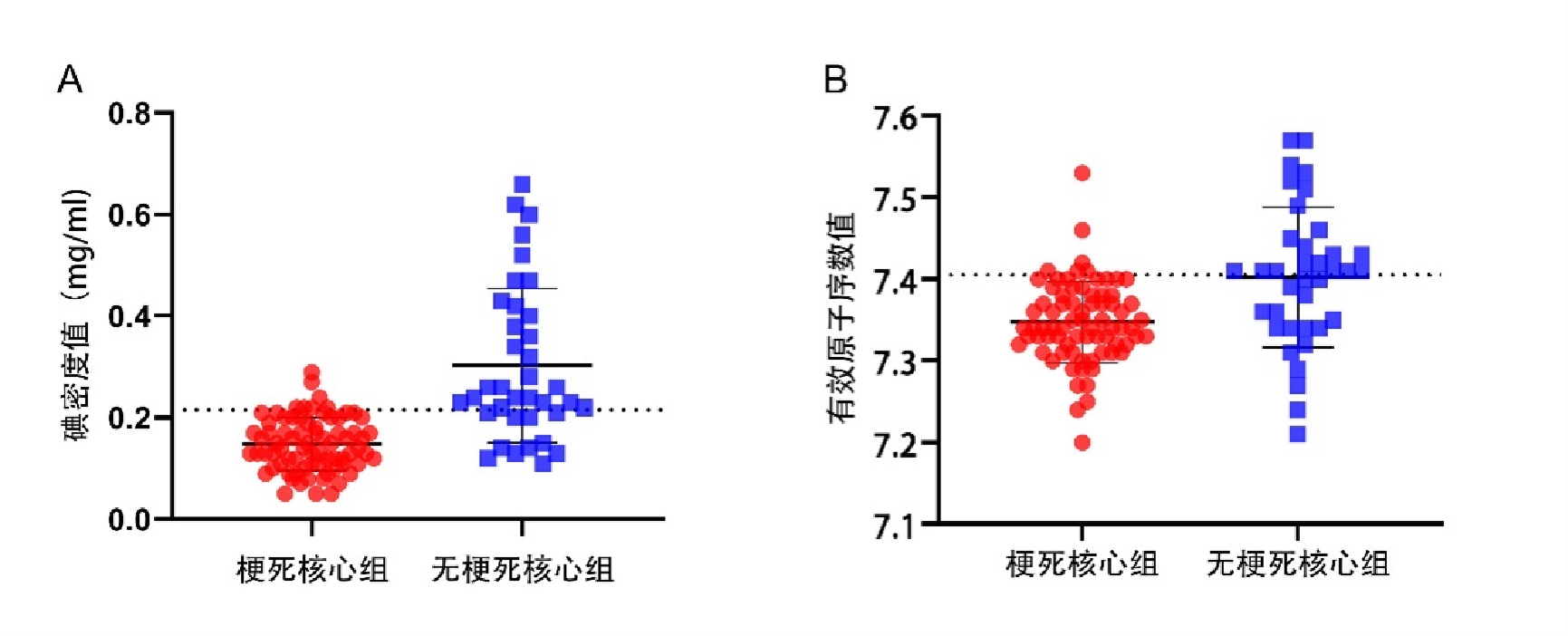 | A:碘密度值在梗死核心区与半暗带区的截断值为0.215 mg/mL;B:有效原子序数值在梗死核心区与半暗带区的截断值为7.405 图 2 碘密度值及有效原子序数值的截断值 Fig 2 Cut off values of iodine density and effective atomic number values |