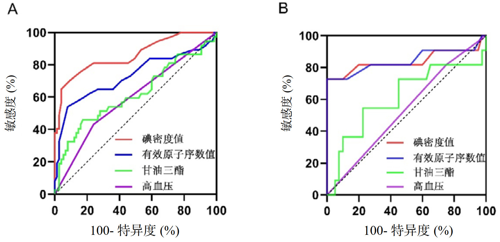 在训练集中,对碘密度值、高血压、甘油三酯等多因素分析中具有统计学意义的指标进行ROC曲线分析,结果显示碘密度值的曲线下面积(AUC)最大(0.859),敏感度为70.27%,特异度为90.67%,显示出较高的预测价值,其他指标的AUC值均低于0.7,预测价值相对较低。此外,尽管多因素分析结果中有效原子序数未显示出统计学显著性,但在ROC曲线分析中仍表现出一定的预测效能,提示其在临床上可能具有潜在的参考价值。验证集的ROC曲线分析结果与训练集一致,见表 5、图 3。