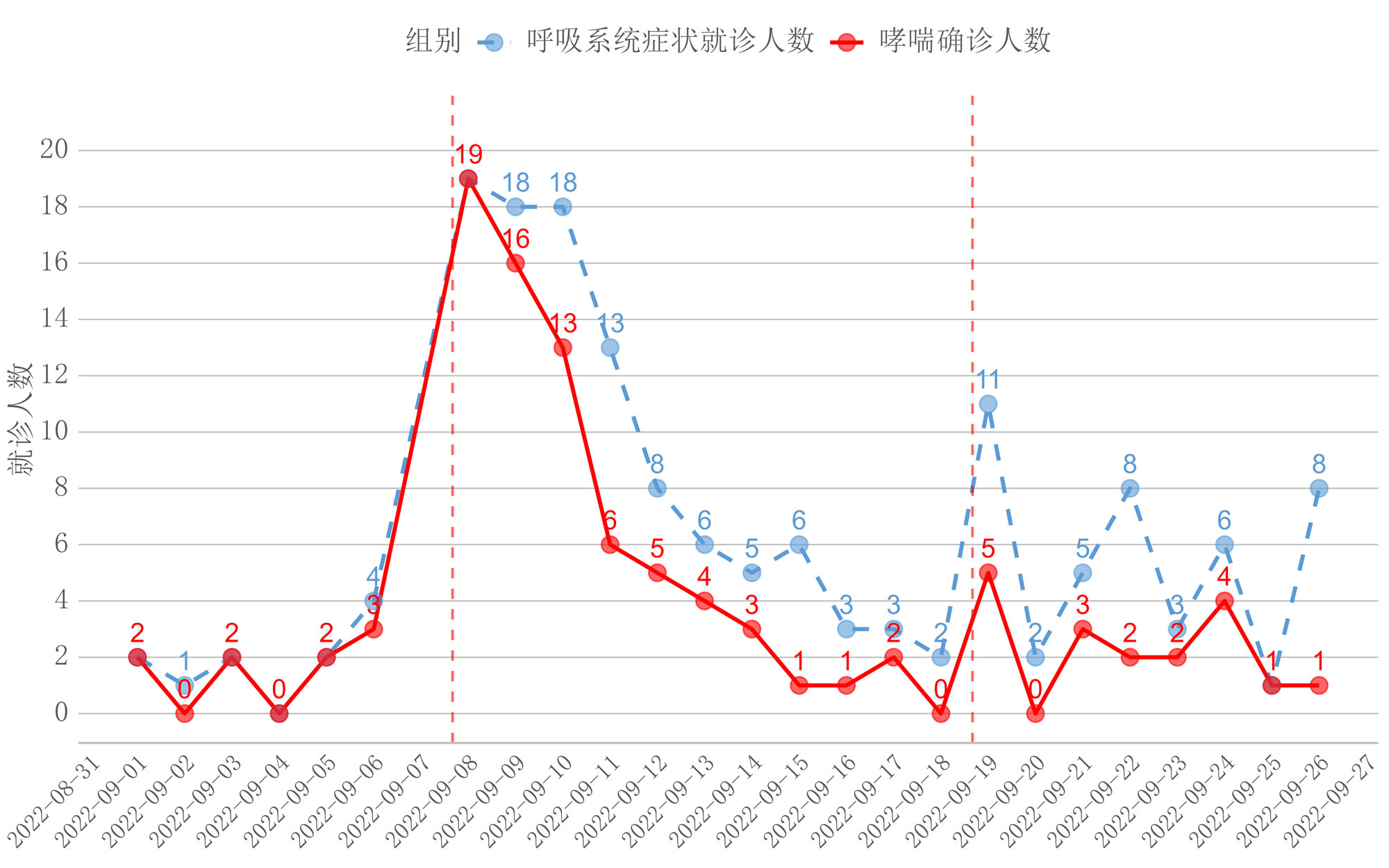 2 结果 2.1 不同时间段急性呼吸系统症状就诊患者情况2022年9月8日和2022年9月19日前后7 d时间共有156例因呼吸系统症状就诊于宁夏医科大学总医院的患者,其中最终明确诊断为哮喘的患者97例。雷暴发生后4 d内为呼吸系统症状患者就诊的高峰,第二次雷暴发生后以呼吸系统症状就诊的患者持续时间较长。而最终诊断为哮喘的患者则在雷暴发生后的3 d内,第二次雷暴发生后哮喘患者就诊的数量也存在平台期,持续时间约为5 d(图 1)。分别对雷暴发生前4 d(未发生)、第一次和第二次雷暴发生后的4 d(组1、组2)进行统计分析,结果发现雷暴未发生时以急性呼吸系统症状就诊的就患者共计有5例,明确诊断为哮喘的患者为4例;第一次雷暴发生后的4 d共计有65例因呼吸系统症状就诊的患者,明确诊断为哮喘的患者为51例;第二次雷暴发生后的4 d共计有18例因呼吸系统症状就诊的患者,而明确诊断为哮喘的患者仅为8例(图 2)。