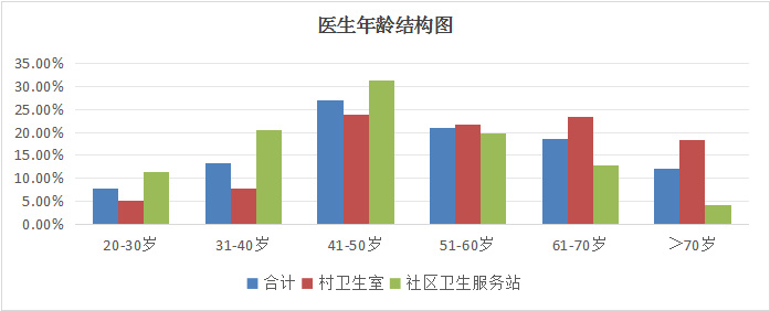 5 319家村卫生室和社区卫生服务站共有医生6 580名,其中男性3 944名(59.9%)、女性2 636名(40.1%);3 553家(66.8%)只有1名医生。年龄中位数为52(44,65)岁,61~70岁的医生1236名(18.8%),70岁以上的医生805名(12.2%)。其中社区卫生服务站20~50岁年龄段的中青年医生比例达63.1%,并已形成较合理的年龄梯队;而村卫生室大于50岁医生比例为62.7%,大于60岁的医生占比达41.7%,30岁以下年轻医生仅有5.1%,且具有执业医师资格比例偏低(图 1)。社区卫生服务站的医生年龄结构显著优于村卫生室(P < 0..001,表 2图 2)