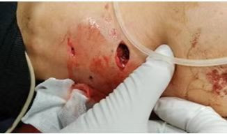 患者,女性,55岁。因“被犬咬伤左侧颈部致疼痛出血4 h”于2023-02-19 21:40送入本院抢救室,家属诉患者4 h前被犬咬伤颈部及左下肢,伤口疼痛伴大量出血,量约500 mL, 有头晕目眩,胸闷恶心,无呕吐。查体:体温36.4 ℃,呼吸频率20次/min,脉率72次/min,血压88/51 mmHg(1 mmHg=0.133 kPa),SaO2 95%。神志清,精神差,面色苍白,眼部及面部皮肤挫伤,左侧颈部4处伤口,最大处5 cm,余为2 cm、2 cm、1 cm(图 1),左小腿内侧12 cm皮肤撕裂伤,外侧4 cm、8 cm两处撕裂伤,均有活动性出血,肢体活动尚可。入院后予创口加压包扎止血。颈部增强CT示:左侧颈内静脉损伤(图 2)。诊断:(1)颈部开放性损伤;(2)失血性休克;(3)下肢开放性伤口。予以输注“去白红细胞2 U及冰冻血浆200 mL”,注射狂犬病免疫球蛋白等处置后建议急诊手术探查,家属知情同意后入手术室行颈部探查术+清创缝合术。术中见左颈4处伤口,最大处5 cm,余2 cm、2 cm、1 cm,延长大切口至7 cm左右予以探查,见左侧胸锁乳突肌部分断裂,分开肌肉见左颈内静脉局部裂口,边缘毛糙,长度约1 cm,裂口内血栓形成,取出血栓后见鲜血涌出,予血管破口缝合止血(图 3)。探查其余3处切口,左下切口较深,予以延长切口至3.5 cm左右,未见明显血管损伤,碘伏及生理盐水交替冲洗各伤口,两处较长伤口各放置引流片1条,颈部无菌敷料加压包扎伤口,左小腿创口清创缝合,全麻清醒后回耳鼻咽喉科病房。