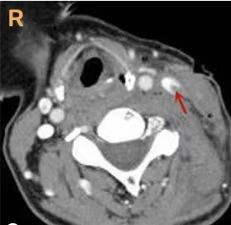 | 图 2 术前颈部增强CT示左侧颈内静脉损伤 |
